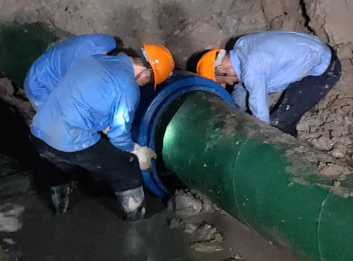 该管道由于受附近施工单位外力影响突发漏水,导致片区出现低压供水,部分高层居民家中停水。同时,由于管道基础被水流破坏,导致管道连续破损。抢修人员通过堵漏与更新的方式,轮班作业,并协调多辆应急送水车全力保障居民生活用水需求。